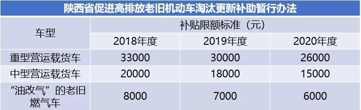 到2020年底前,全省淘汰高排放国三及以下排放标准营运柴油货车11万辆、老旧燃气车2万辆,其中西安、宝鸡、咸阳、铜川、渭南市和杨凌示范区基本淘汰国三及以下排放标准营运中、重型柴油货车,其他各市淘汰总量的30%以上。