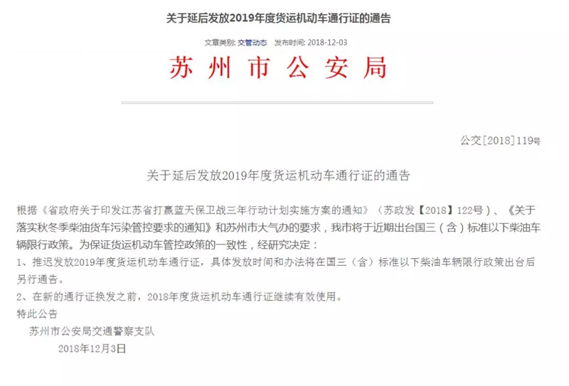 最新消息!苏州2019年货车通行证延迟发放,国三车和外地车将面临城区限行!(另城区已扩大,北到太阳路,南到东方大道,西到金枫路,东到唯胜路含苏州工业园区。)