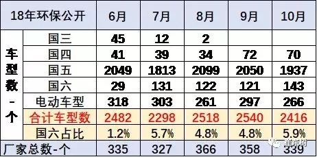 原文是:2018年10月,共有339家企业公开了2416个车型的环保 信息(详见表1),其中国四车型70个(详见表2),国五车型 1937个(详见表3),国六车型143个(详见表4),电动车型 266个(详见表5)。