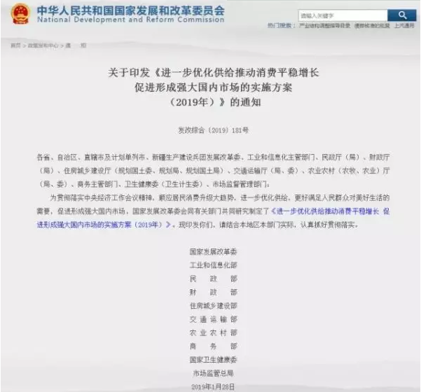 据国家发展改革委1月29日消息,为贯彻落实中央经济工作会议精神,顺应居民消费升级大趋势,进一步优化供给,更好满足人民群众对美好生活的需要,促进形成强大国内市场,国家发展改革委会同有关部门共同研究制定了《进一步优化供给推动消费平稳增长 促进形成强大国内市场的实施方案(2019年)》。