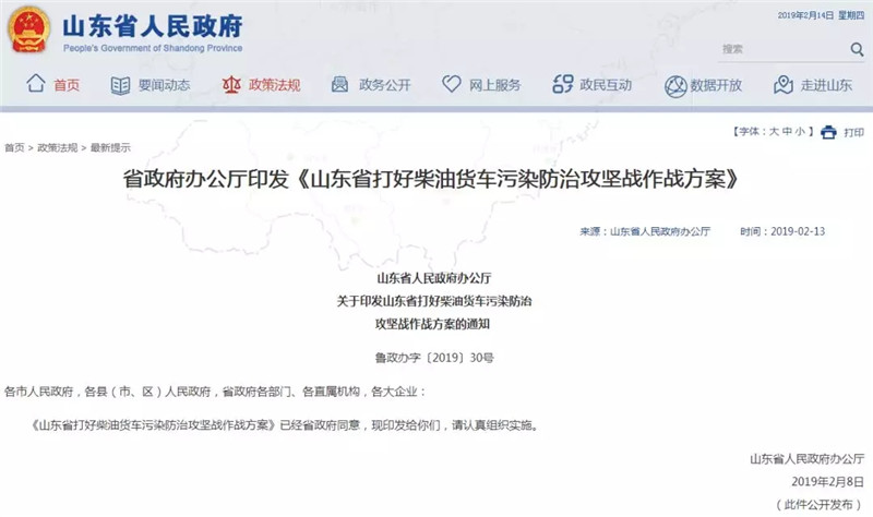 2月13日,山东省人民政府办公厅发布关于印发《山东省打好柴油货车污染防治攻坚战作战方案》的通知。
