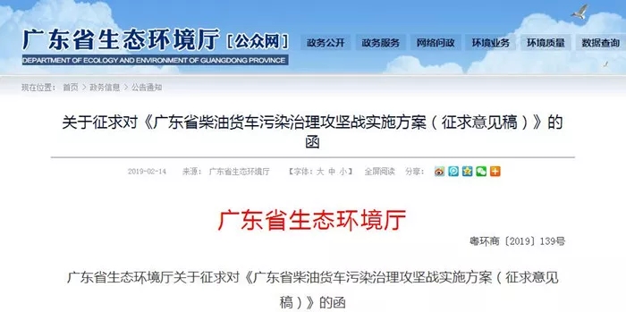 2019年2月14日,广东省生态环境厅发布了《广东省柴油货车污染治理攻坚战实施方案(征求意见稿)》。