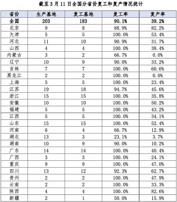 23家企业集团(203个生产基地,年销量占比超过 96%),截至 3月 11日,183个生产基地复工,复工率 90.1%;复产率 39.2%;员工 返岗率 7.0%。