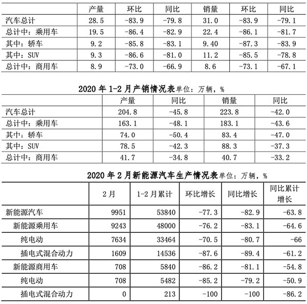 2月,汽车产销环比和同比大幅下降。当月汽车产销分别完成28.5万辆和 31万辆,环比均下降 83.9%,同比分别下降 79.8%和79.1%。其中,乘用车产销分别完成 19.5万辆和 2.4万辆,产销环 比分别下降 86.4%和 86.1%,同比分别下降 82.9%和 81.7%;商用车产 销分别完成 8.9万辆和 8.6万辆,环比均下降 73%,同比分别下降 6.9%和 67.1%。