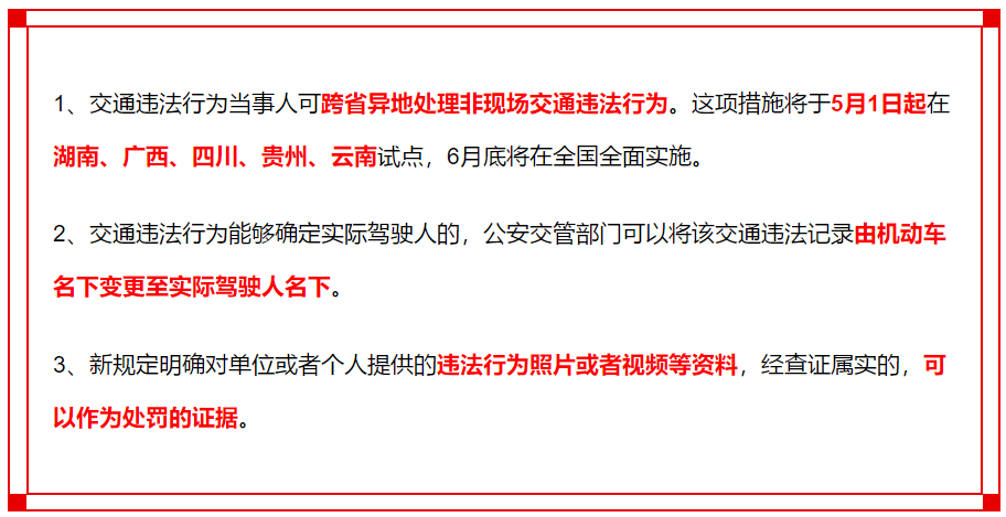 1、交通违法行为当事人可跨省异地处理非现场交通违法行为。这项措施将于5月1日起在湖南、广西、四川、贵州、云南试点,6月底将在全国全面实施。