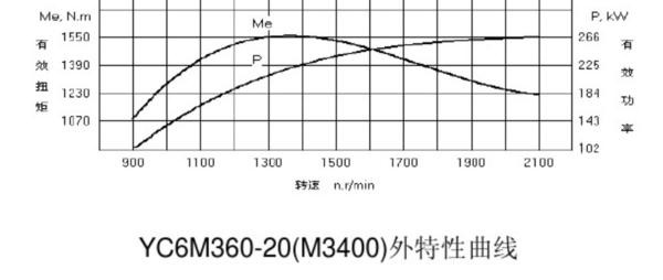 当发动机转速在900转时,发动机输出102kW,输出扭矩为1070牛米。最终YC6M360-20发动机的最大功率为266kW,最大扭矩为1550牛米。