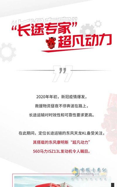 疫情期间,救援物资昼夜不停地奔波在路上,在这种情况下,对时效性与可靠性的要求更高。其中,定位于长途运输的东风天龙KL备受关注,因其搭载东风康明斯“超凡动力”备受瞩目。