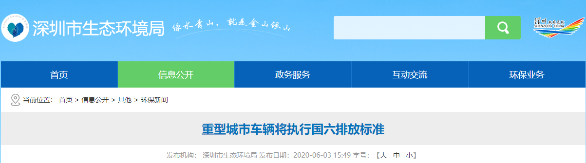 6月3日,深圳市生态环境局发布重型城市车辆将执行国六排放标准的通知,为控制机动车排气污染,根据国家标准《重型柴油车污染物排放限值及测量方法(中国第六阶段)》(GB17691-2018)的规定,自2020年7月1日起,深圳市所有生产、进口、销售和注册登记的重型城市车辆应符合国6a排放标准。