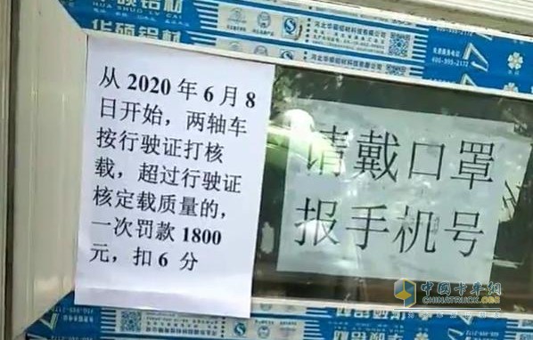 此外,有卡友拍到北京延庆区的超限站里贴出通知,从2020年6月8日开始,两轴车按行驶证打核载,超过行驶证核定载质量的,一次罚款1800元,扣6分。对存在车辆私改、不按货车行驶证规定标明总质量从事货车超载超限运输的违法行为进行整治。
